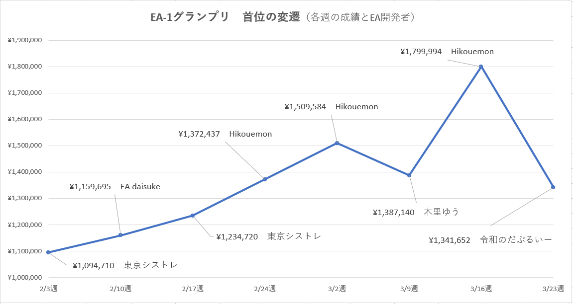 2020年2月3日(月曜)オープン~4月24日(金曜)クローズまでの約3か月にわたり、運用成績を競うEA-1グランプリは、あと1か月を切りました。
